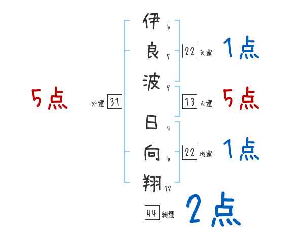 総運![]() | 伊良波日向翔さんの総運は44画の2つ星!誠実で慎重な性格。物事を考えすぎないように注意しましょう。 あなたの人生を表す1番重要な運勢です。生涯を通じて影響する総合運となり、主に50歳以降の晩年期に影響を及ぼします。 |