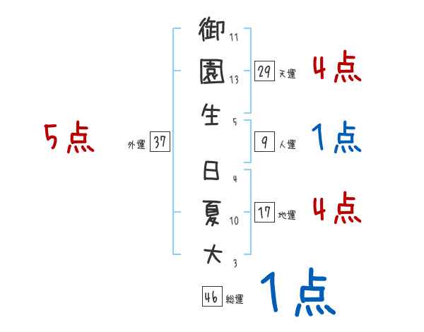 天運![]() | 御園生日夏大さんの天運は29画の4つ星!完全主義で才能がある。厳格な心の持ち主。 家系が持つ宿命的な運勢を表します。祖先から受け継いだ苗字ですので自分の力が及びません。家柄を象徴します。 |