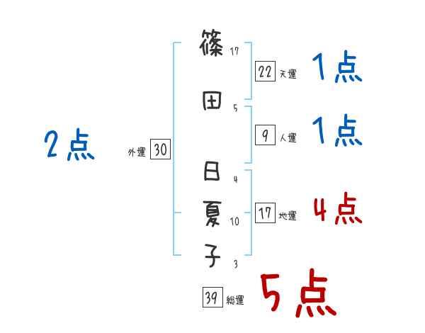 天運![]() | 篠田日夏子さんの天運は22画の1つ星!努力することが苦手ないっぽう手先が器用。芸術性にも優れる。 家系が持つ宿命的な運勢を表します。祖先から受け継いだ苗字ですので自分の力が及びません。家柄を象徴します。 |