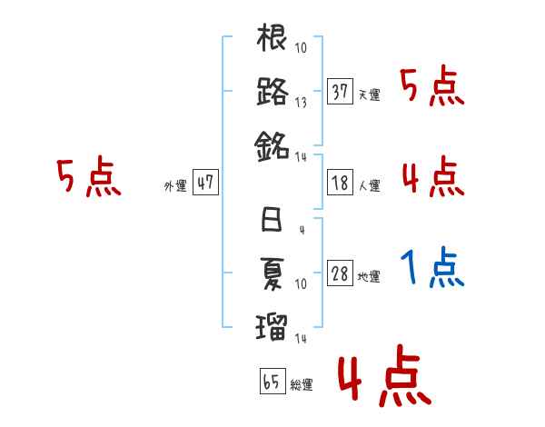 外運![]() | 根路銘日夏瑠さんの外運は47画の5つ星!実力が開花し発展する円満な人生。財に恵まれる。 生活面を象徴する運勢です。外部から受ける影響力を表し、結婚運、家庭運や職場、環境への順応性を表します。 |