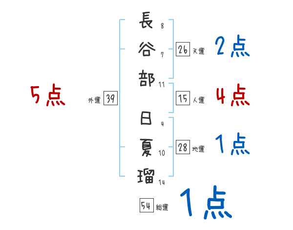 外運![]() | 長谷部日夏瑠さんの外運は39画の5つ星!社交性に優れ人望が厚い。人の上に立ち成功する。 生活面を象徴する運勢です。外部から受ける影響力を表し、結婚運、家庭運や職場、環境への順応性を表します。 |