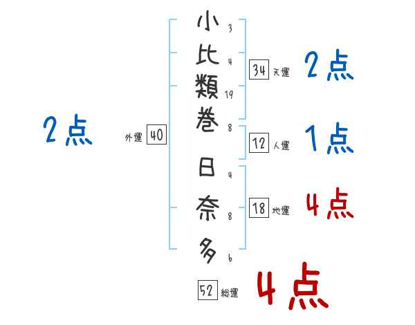 外運![]() | 小比類巻日奈多さんの外運は40画の2つ星!自信過剰で物事に固執するためトラブルに注意。 生活面を象徴する運勢です。外部から受ける影響力を表し、結婚運、家庭運や職場、環境への順応性を表します。 |