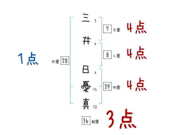 外運![]() | 三井日憂真さんの外運は28画の1つ星!家庭環境に注意。スポーツで活躍できる能力があるかも。 生活面を象徴する運勢です。外部から受ける影響力を表し、結婚運、家庭運や職場、環境への順応性を表します。 |