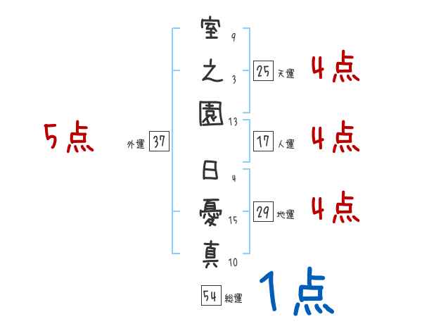 総運![]() | 室之園日憂真さんの総運は54画の1つ星!トラブルが多いかも。周りをよく見て協調して過ごしましょう。 あなたの人生を表す1番重要な運勢です。生涯を通じて影響する総合運となり、主に50歳以降の晩年期に影響を及ぼします。 |