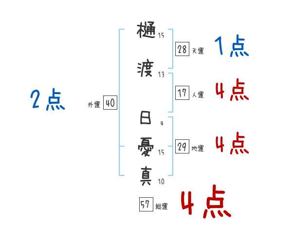 | 外運  | 樋渡日憂真さんの外運は40画の2つ星!自信過剰で物事に固執するためトラブルに注意。生活面を象徴する運勢です。外部から受ける影響力を表し、結婚運、家庭運や職場、環境への順応性を表します。 |