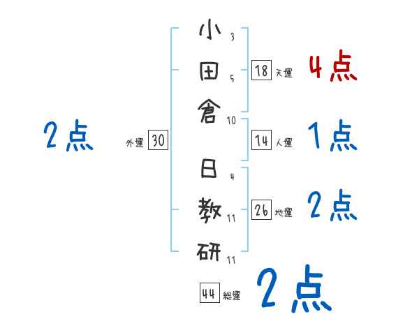 総運![]() | 小田倉日教研さんの総運は44画の2つ星!誠実で慎重な性格。物事を考えすぎないように注意しましょう。 あなたの人生を表す1番重要な運勢です。生涯を通じて影響する総合運となり、主に50歳以降の晩年期に影響を及ぼします。 |