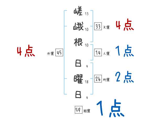 地運![]() | 嵯峨根日曜日さんの地運は26画の2つ星!波瀾万丈かも。信頼できる人を大事にしましょう。 個性を表す基礎的な運勢です。性格形成や対人関係、行動力など家庭環境に影響されます。主に誕生してから20歳くらいまでの若年期の運勢を表します。 |
