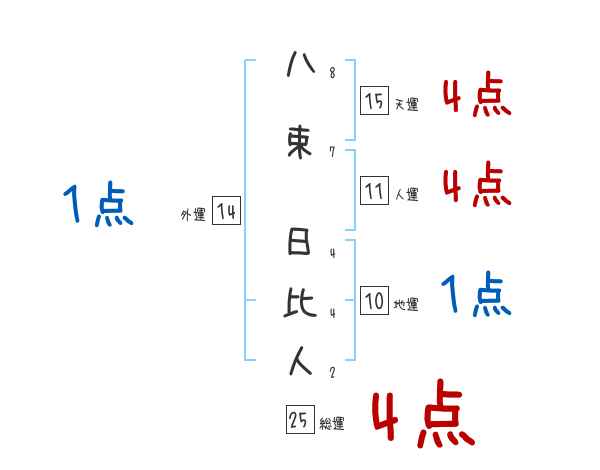 外運![]() | 八束日比人さんの外運は14画の1つ星!人に対して優しいがストレスを溜め込みがち。人間関係のトラブルを避けるよう気をつけましょう。 生活面を象徴する運勢です。外部から受ける影響力を表し、結婚運、家庭運や職場、環境への順応性を表します。 |