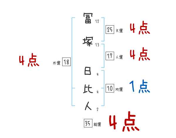 人運![]() | 冨塚日比人さんの人運は17画の4つ星!積極的な行動力。地位を気づき財産を手に入れる。純粋な心と直感力。 性格や才能などを表す2番目に重要な運勢です。人間関係や協調性、社会的な成功に影響します。主に20歳から50歳ぐらいまでの中年期の運勢を表します。 |