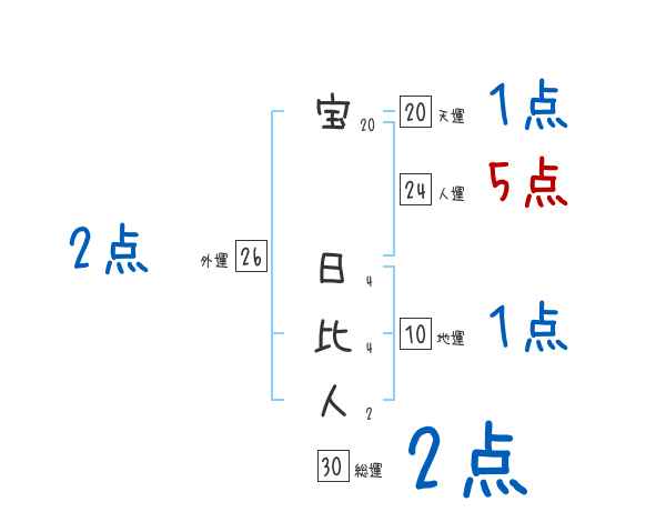 人運![]() | 宝日比人さんの人運は24画の5つ星!家庭運が良く順調な人生。金運にも恵まれる。 性格や才能などを表す2番目に重要な運勢です。人間関係や協調性、社会的な成功に影響します。主に20歳から50歳ぐらいまでの中年期の運勢を表します。 |