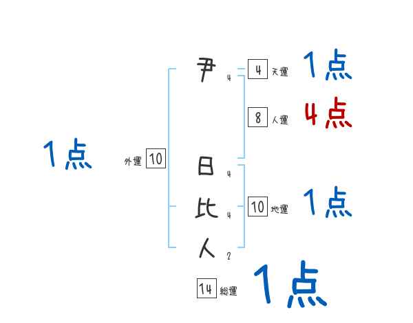 天運![]() | 尹日比人さんの天運は4画の1つ星!感情が不安定で苦労するかも。周囲との協調を心掛けましょう。 家系が持つ宿命的な運勢を表します。祖先から受け継いだ苗字ですので自分の力が及びません。家柄を象徴します。 |
