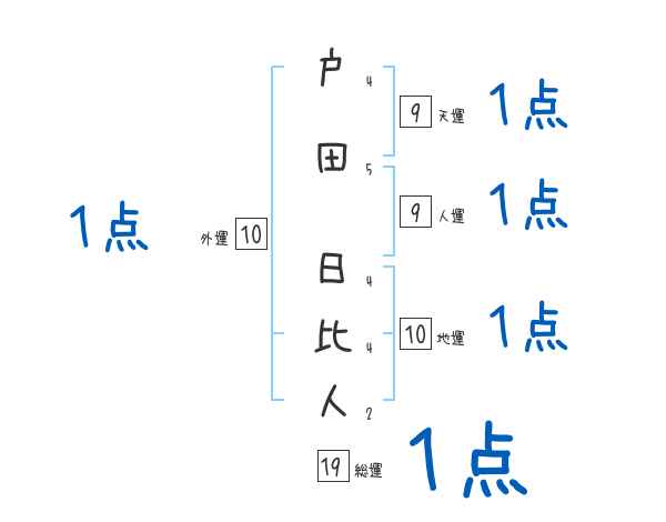 天運![]() | 戸田日比人さんの天運は9画の1つ星!消極的で才能を発揮することが苦手なことも。周りの意見に耳を傾けましょう。 家系が持つ宿命的な運勢を表します。祖先から受け継いだ苗字ですので自分の力が及びません。家柄を象徴します。 |