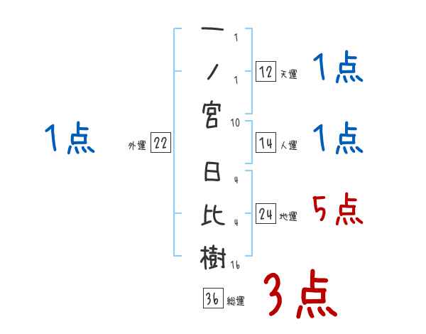 外運![]() | 一ノ宮日比樹さんの外運は22画の1つ星!努力することが苦手ないっぽう手先が器用。芸術性にも優れる。 生活面を象徴する運勢です。外部から受ける影響力を表し、結婚運、家庭運や職場、環境への順応性を表します。 |