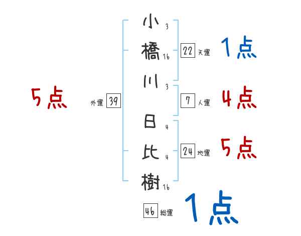 外運![]() | 小橋川日比樹さんの外運は39画の5つ星!社交性に優れ人望が厚い。人の上に立ち成功する。 生活面を象徴する運勢です。外部から受ける影響力を表し、結婚運、家庭運や職場、環境への順応性を表します。 |