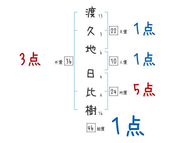 外運![]() | 渡久地日比樹さんの外運は36画の3つ星!先見性が豊かです。多少神経質で苦労することも。 生活面を象徴する運勢です。外部から受ける影響力を表し、結婚運、家庭運や職場、環境への順応性を表します。 |