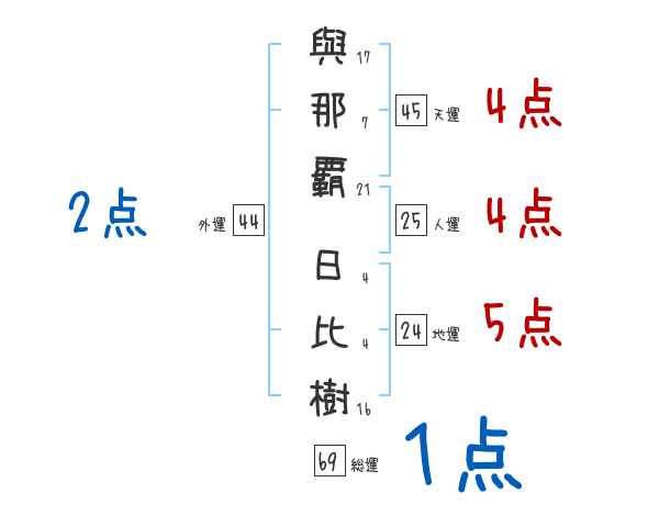 天運![]() | 與那覇日比樹さんの天運は45画の4つ星!もくもくと物事を進め達成する。地味な努力家。 家系が持つ宿命的な運勢を表します。祖先から受け継いだ苗字ですので自分の力が及びません。家柄を象徴します。 |