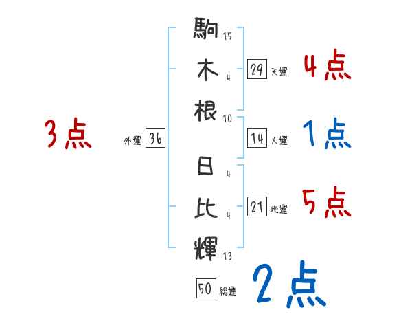 外運![]() | 駒木根日比輝さんの外運は36画の3つ星!先見性が豊かです。多少神経質で苦労することも。 生活面を象徴する運勢です。外部から受ける影響力を表し、結婚運、家庭運や職場、環境への順応性を表します。 |