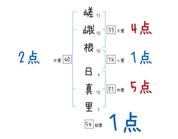 天運![]() | 嵯峨根日真里さんの天運は33画の4つ星!権力志向でプライドが高い。勇気があり運を切り開き成功する。 家系が持つ宿命的な運勢を表します。祖先から受け継いだ苗字ですので自分の力が及びません。家柄を象徴します。 |