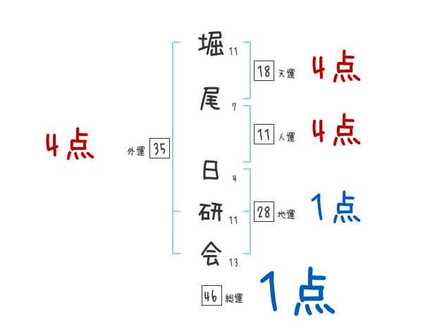 外運![]() | 堀尾日研会さんの外運は35画の4つ星!温厚な性格で感受性が高い。穏和な性格で人望が厚い。 生活面を象徴する運勢です。外部から受ける影響力を表し、結婚運、家庭運や職場、環境への順応性を表します。 |
