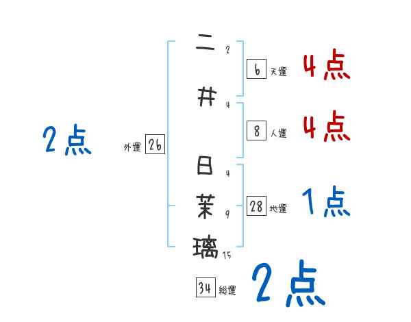 外運![]() | 二井日茉璃さんの外運は26画の2つ星!波瀾万丈かも。信頼できる人を大事にしましょう。 生活面を象徴する運勢です。外部から受ける影響力を表し、結婚運、家庭運や職場、環境への順応性を表します。 |
