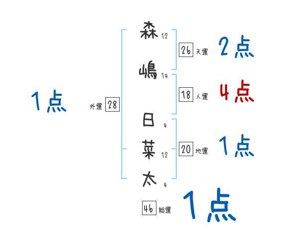 総運![]() | 森嶋日菜太さんの総運は46画の1つ星!迷走することが多く苦労するかも。目先のことにとらわれないように。 あなたの人生を表す1番重要な運勢です。生涯を通じて影響する総合運となり、主に50歳以降の晩年期に影響を及ぼします。 |