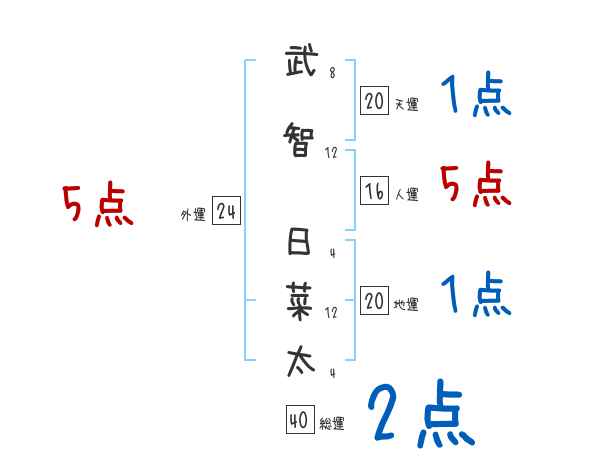 外運![]() | 武智日菜太さんの外運は24画の5つ星!家庭運が良く順調な人生。金運にも恵まれる。 生活面を象徴する運勢です。外部から受ける影響力を表し、結婚運、家庭運や職場、環境への順応性を表します。 |