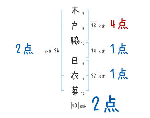 天運![]() | 木戸脇日衣菜さんの天運は18画の4つ星!情熱的で剛気。忍耐力があり信頼される。 家系が持つ宿命的な運勢を表します。祖先から受け継いだ苗字ですので自分の力が及びません。家柄を象徴します。 |