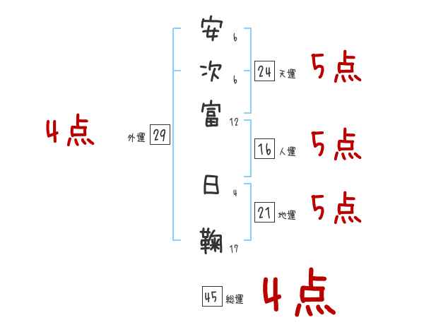 外運![]() | 安次富日鞠さんの外運は29画の4つ星!完全主義で才能がある。厳格な心の持ち主。 生活面を象徴する運勢です。外部から受ける影響力を表し、結婚運、家庭運や職場、環境への順応性を表します。 |