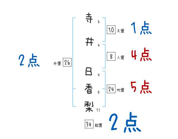 総運![]() | 寺井日香梨さんの総運は34画の2つ星!独創性に優れるが、自尊心が強く災難に注意しましょう。 あなたの人生を表す1番重要な運勢です。生涯を通じて影響する総合運となり、主に50歳以降の晩年期に影響を及ぼします。 |