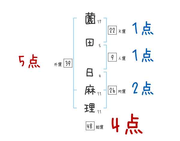 外運![]() | 薗田日麻理さんの外運は39画の5つ星!社交性に優れ人望が厚い。人の上に立ち成功する。 生活面を象徴する運勢です。外部から受ける影響力を表し、結婚運、家庭運や職場、環境への順応性を表します。 |