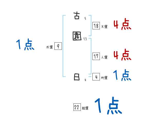 総運![]() | 古園日さんの総運は22画の1つ星!努力することが苦手ないっぽう手先が器用。芸術性にも優れる。 あなたの人生を表す1番重要な運勢です。生涯を通じて影響する総合運となり、主に50歳以降の晩年期に影響を及ぼします。 |
