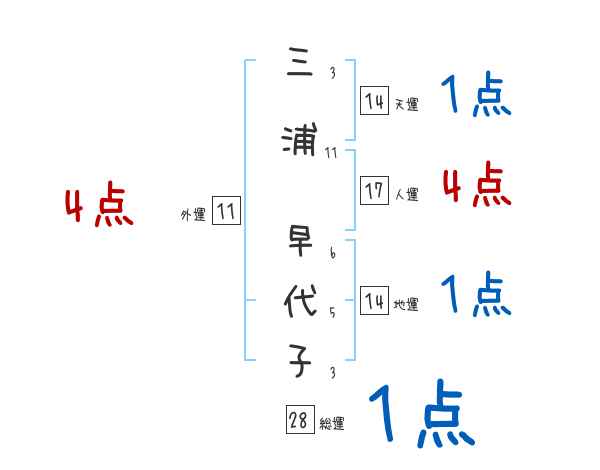 天運![]() | 三浦早代子さんの天運は14画の1つ星!人に対して優しいがストレスを溜め込みがち。人間関係のトラブルを避けるよう気をつけましょう。 家系が持つ宿命的な運勢を表します。祖先から受け継いだ苗字ですので自分の力が及びません。家柄を象徴します。 |