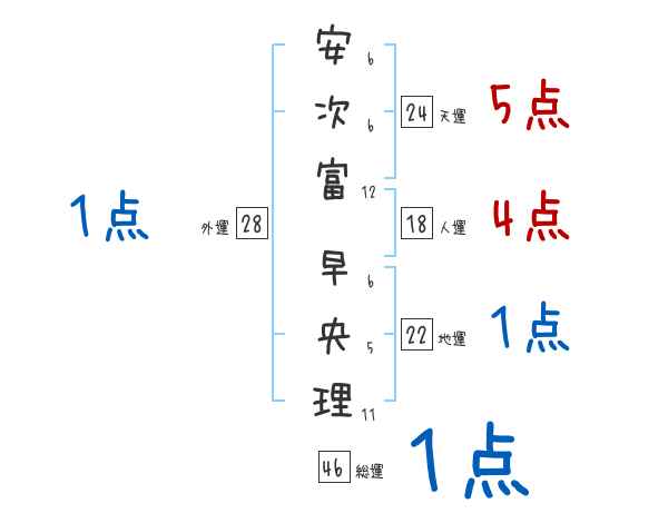 天運![]() | 安次富早央理さんの天運は24画の5つ星!家庭運が良く順調な人生。金運にも恵まれる。 家系が持つ宿命的な運勢を表します。祖先から受け継いだ苗字ですので自分の力が及びません。家柄を象徴します。 |