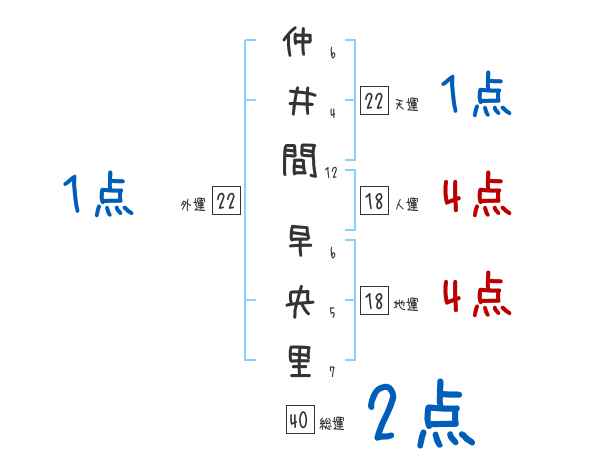 外運![]() | 仲井間早央里さんの外運は22画の1つ星!努力することが苦手ないっぽう手先が器用。芸術性にも優れる。 生活面を象徴する運勢です。外部から受ける影響力を表し、結婚運、家庭運や職場、環境への順応性を表します。 |