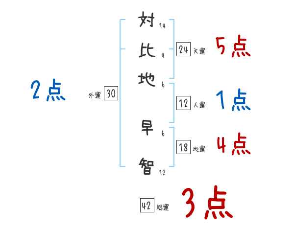 総運![]() | 対比地早智さんの総運は42画の3つ星!病気に注意。多芸であるが消極的でおとなしい。 あなたの人生を表す1番重要な運勢です。生涯を通じて影響する総合運となり、主に50歳以降の晩年期に影響を及ぼします。 |