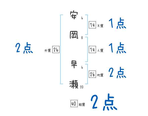外運![]() | 安岡早瀬さんの外運は26画の2つ星!波瀾万丈かも。信頼できる人を大事にしましょう。 生活面を象徴する運勢です。外部から受ける影響力を表し、結婚運、家庭運や職場、環境への順応性を表します。 |