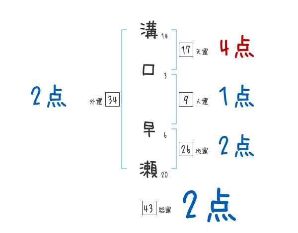 外運![]() | 溝口早瀬さんの外運は34画の2つ星!独創性に優れるが、自尊心が強く災難に注意しましょう。 生活面を象徴する運勢です。外部から受ける影響力を表し、結婚運、家庭運や職場、環境への順応性を表します。 |