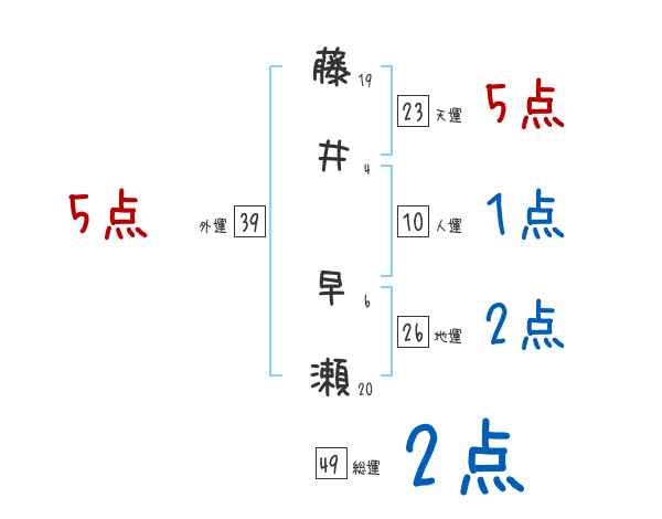 外運![]() | 藤井早瀬さんの外運は39画の5つ星!社交性に優れ人望が厚い。人の上に立ち成功する。 生活面を象徴する運勢です。外部から受ける影響力を表し、結婚運、家庭運や職場、環境への順応性を表します。 |