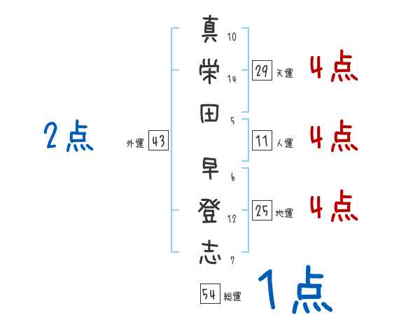 人運![]() | 真栄田早登志さんの人運は11画の4つ星!着実に富や地位を得る幸運な人生。 性格や才能などを表す2番目に重要な運勢です。人間関係や協調性、社会的な成功に影響します。主に20歳から50歳ぐらいまでの中年期の運勢を表します。 |