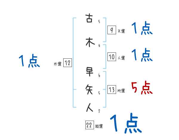 総運![]() | 古木早矢人さんの総運は22画の1つ星!努力することが苦手ないっぽう手先が器用。芸術性にも優れる。 あなたの人生を表す1番重要な運勢です。生涯を通じて影響する総合運となり、主に50歳以降の晩年期に影響を及ぼします。 |