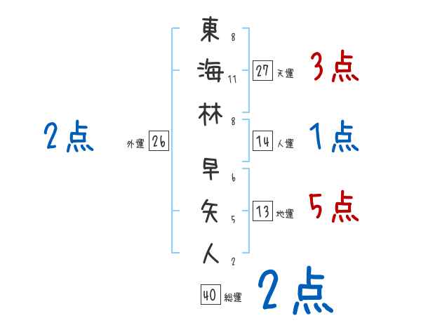 地運![]() | 東海林早矢人さんの地運は13画の5つ星!才能に恵まれ人気がある。名声を手に入れる。円満な人生。 個性を表す基礎的な運勢です。性格形成や対人関係、行動力など家庭環境に影響されます。主に誕生してから20歳くらいまでの若年期の運勢を表します。 |
