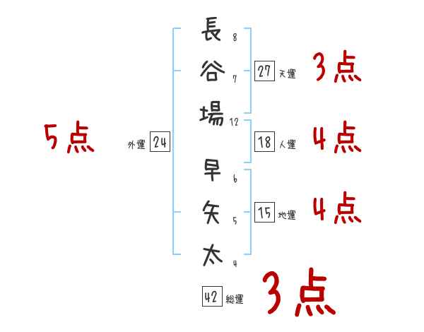外運![]() | 長谷場早矢太さんの外運は24画の5つ星!家庭運が良く順調な人生。金運にも恵まれる。 生活面を象徴する運勢です。外部から受ける影響力を表し、結婚運、家庭運や職場、環境への順応性を表します。 |