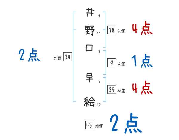 天運![]() | 井野口早絵さんの天運は18画の4つ星!情熱的で剛気。忍耐力があり信頼される。 家系が持つ宿命的な運勢を表します。祖先から受け継いだ苗字ですので自分の力が及びません。家柄を象徴します。 |
