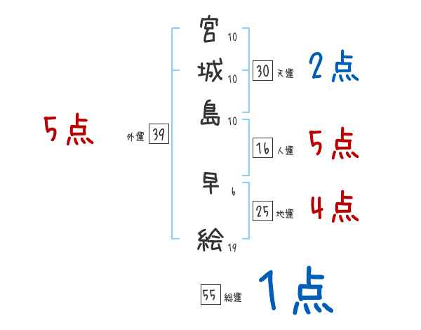 外運![]() | 宮城島早絵さんの外運は39画の5つ星!社交性に優れ人望が厚い。人の上に立ち成功する。 生活面を象徴する運勢です。外部から受ける影響力を表し、結婚運、家庭運や職場、環境への順応性を表します。 |