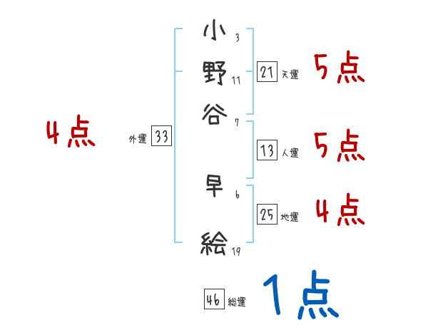 外運![]() | 小野谷早絵さんの外運は33画の4つ星!権力志向でプライドが高い。勇気があり運を切り開き成功する。 生活面を象徴する運勢です。外部から受ける影響力を表し、結婚運、家庭運や職場、環境への順応性を表します。 |