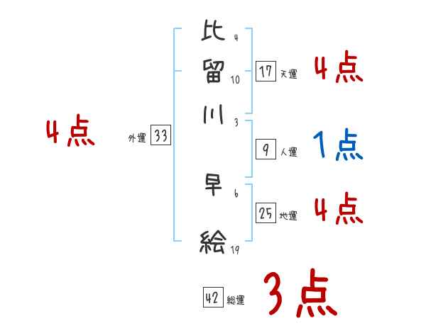 外運![]() | 比留川早絵さんの外運は33画の4つ星!権力志向でプライドが高い。勇気があり運を切り開き成功する。 生活面を象徴する運勢です。外部から受ける影響力を表し、結婚運、家庭運や職場、環境への順応性を表します。 |