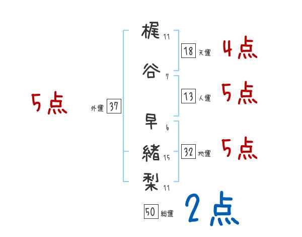天運![]() | 梶谷早緒梨さんの天運は18画の4つ星!情熱的で剛気。忍耐力があり信頼される。 家系が持つ宿命的な運勢を表します。祖先から受け継いだ苗字ですので自分の力が及びません。家柄を象徴します。 |