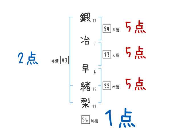 天運![]() | 鍛冶早緒梨さんの天運は24画の5つ星!家庭運が良く順調な人生。金運にも恵まれる。 家系が持つ宿命的な運勢を表します。祖先から受け継いだ苗字ですので自分の力が及びません。家柄を象徴します。 |