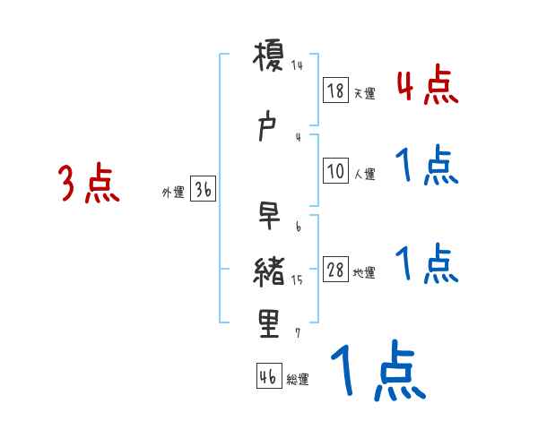 天運![]() | 榎戸早緒里さんの天運は18画の4つ星!情熱的で剛気。忍耐力があり信頼される。 家系が持つ宿命的な運勢を表します。祖先から受け継いだ苗字ですので自分の力が及びません。家柄を象徴します。 |