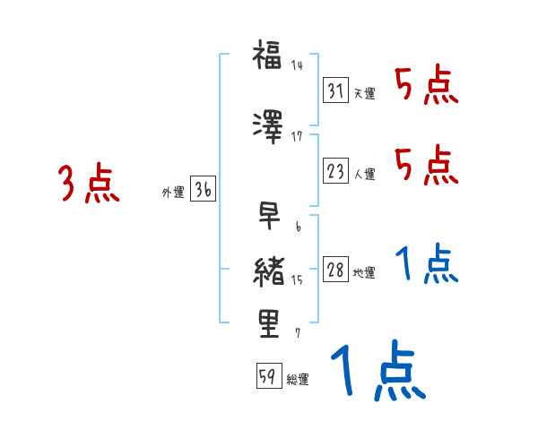 外運![]() | 福澤早緒里さんの外運は36画の3つ星!先見性が豊かです。多少神経質で苦労することも。 生活面を象徴する運勢です。外部から受ける影響力を表し、結婚運、家庭運や職場、環境への順応性を表します。 |